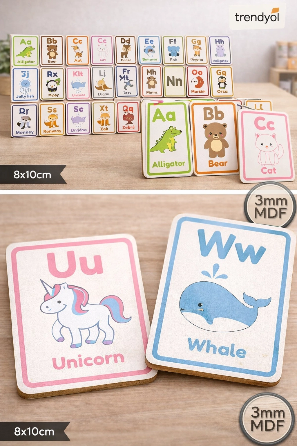 Ahşap Alfabe Kartları – İngilizce Harfler ve Hayvan Figürleri Eğitici Set (A-Z)