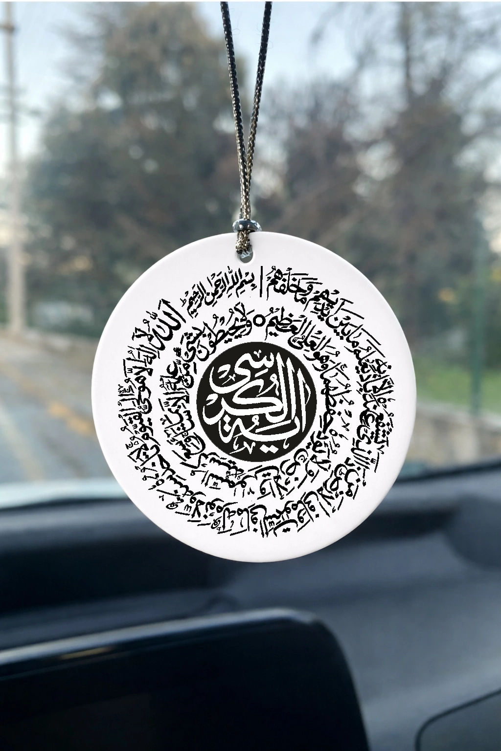 Özenle tasarlanmış Ayet’el Kürsi yazılı araba aynası süsü, estetik görünümü ve anlamlı içeriğiyle dikkat çeker.
