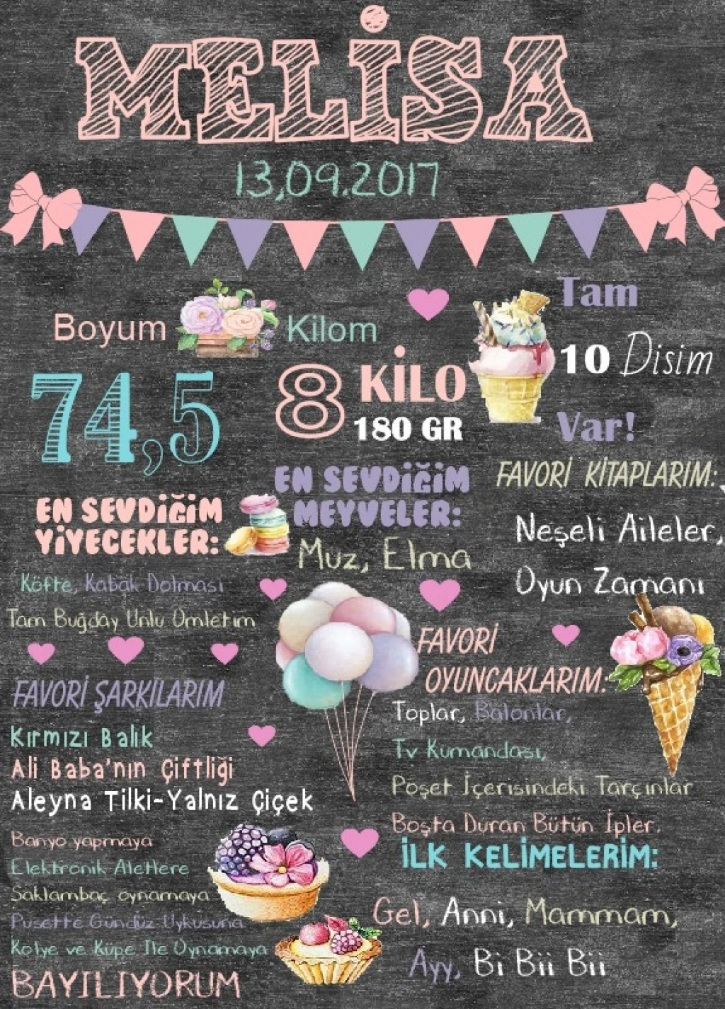 Sipariş sonrası bebeğe ait bilgileri (İsim – Doğum Tarihi – Saat – Boy – Kilo) iletmeniz yeterlidir.