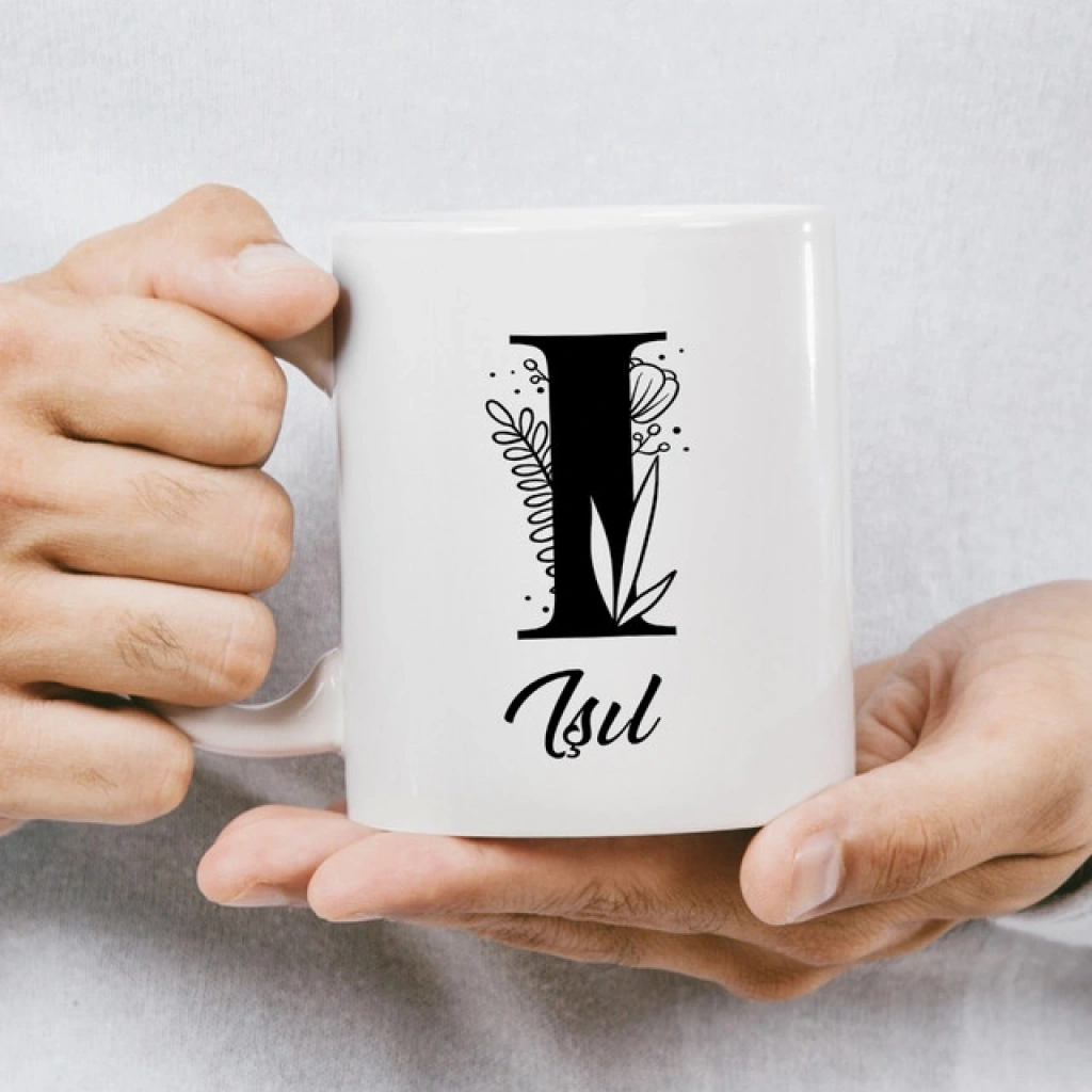 İ Siyah Beyaz Çiçekli İsme Özel Kupa