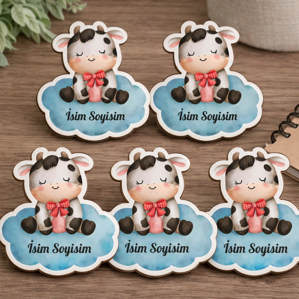Kişiye Özel Sevimli İnek ve Bulut 5 Adet– 5x5 cm MDF İsimlik