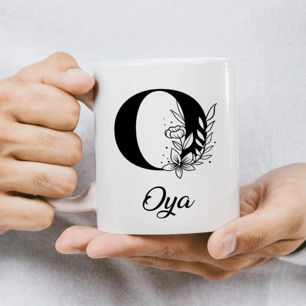 O Siyah Beyaz Çiçekli İsme Özel Kupa
