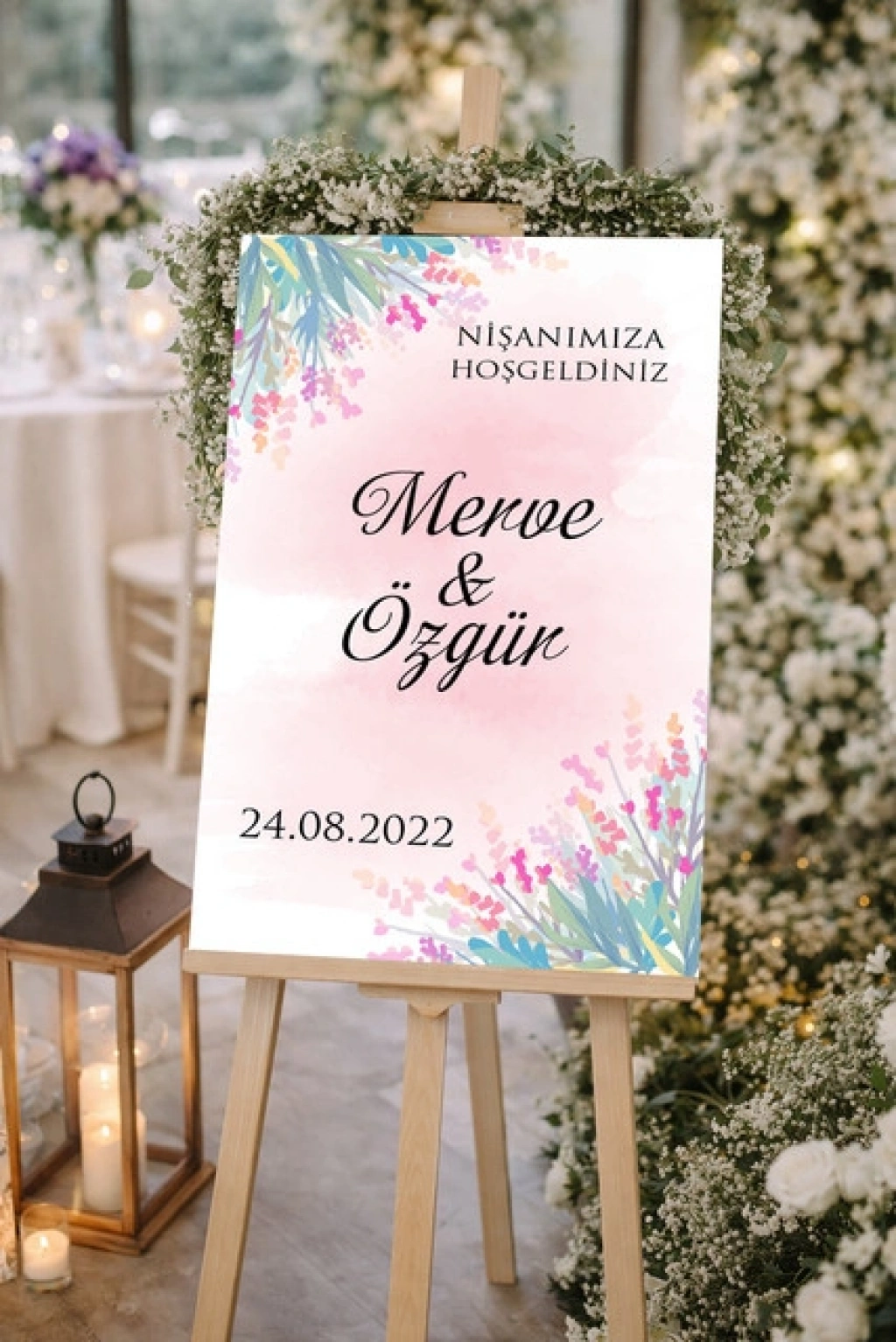 Pembe Çiçekli Düğün, Nişan ve Söz Karşılama Panosu – 50x70 cm