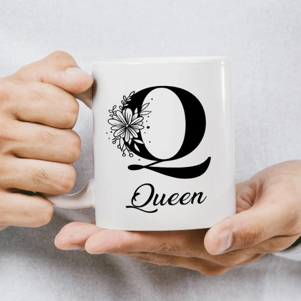 Q Siyah Beyaz Çiçekli İsme Özel Kupa