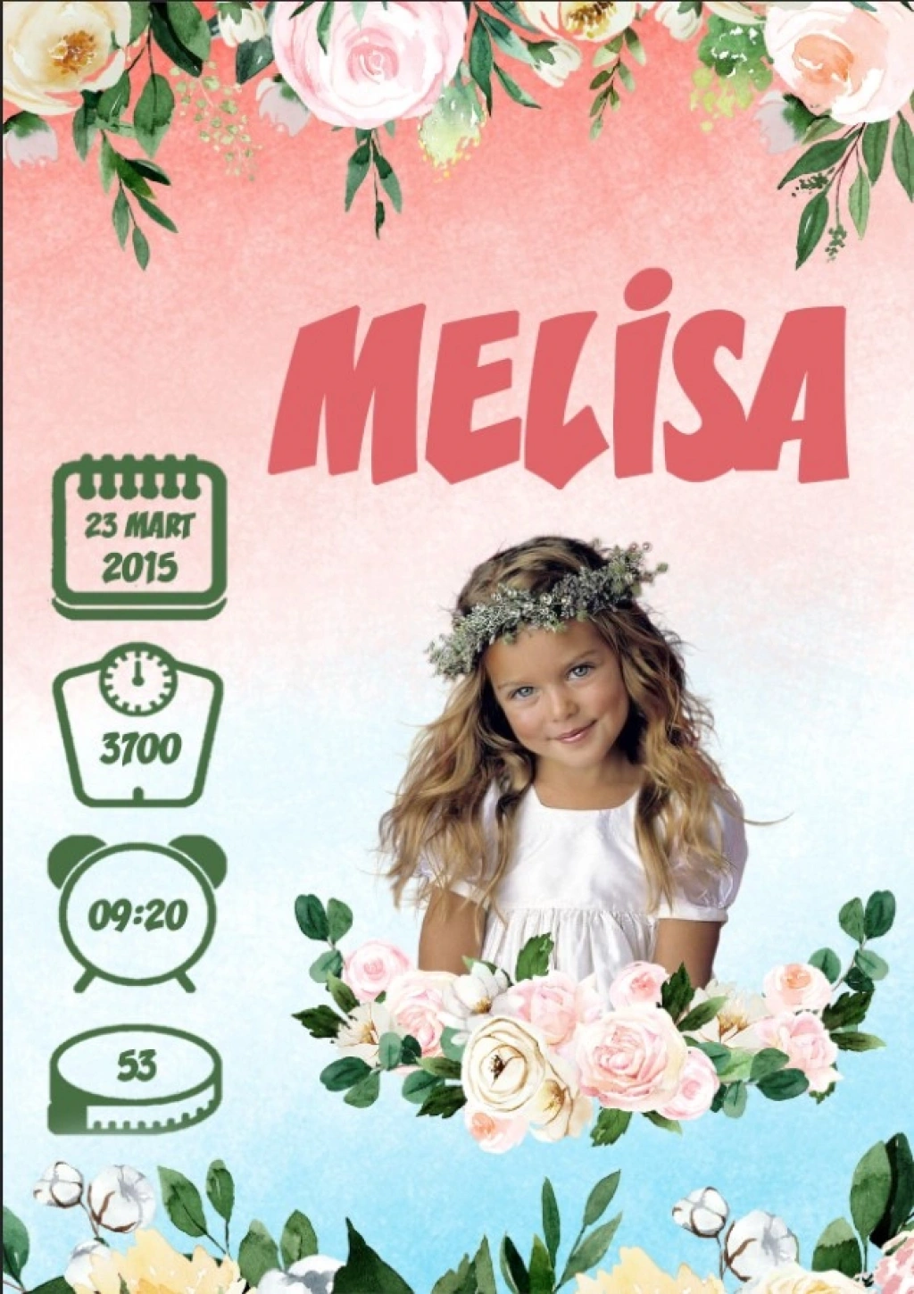 Sipariş sonrası bebeğe ait bilgileri (İsim – Doğum Tarihi – Saat – Boy – Kilo) iletmeniz yeterlidir.