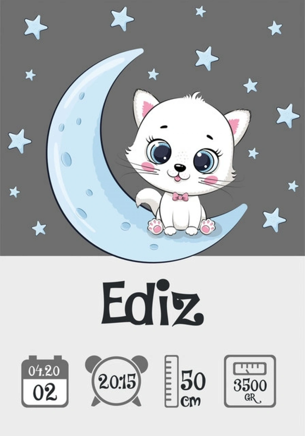 Sipariş sonrası bebeğe ait bilgileri (İsim – Doğum Tarihi – Saat – Boy – Kilo) iletmeniz yeterlidir.