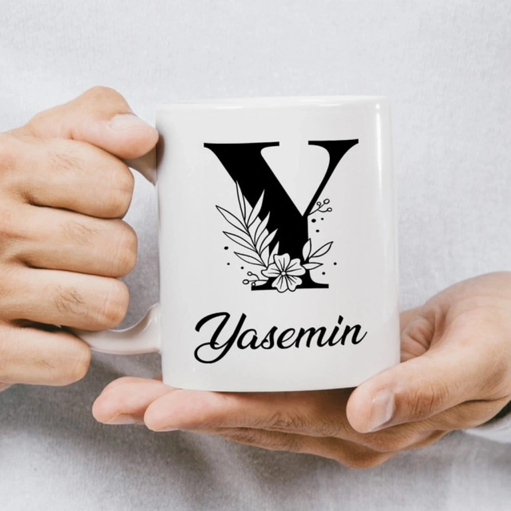 Y Siyah Beyaz Çiçekli İsme Özel Kupa